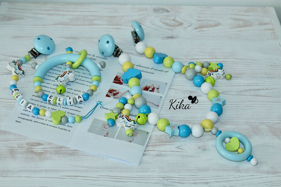 Set di catenella portaciuccio e sonaglio e' un regalo ideale per la nascita, il battesimo ed altre occasioni speciali. Tutti i due prodotti aiutano allo sviluppo sensoriale, motorio e cognitivo del bambino.